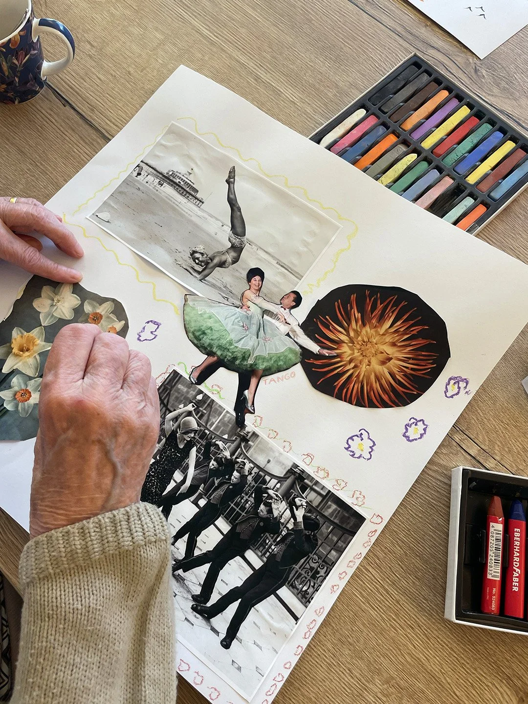 Nadat de collage is gemaakt, voegen we verf en pastelkrijt toe, zo ontstaat een persoonlijk schilderachtig werk vol herinneringen en kleur.